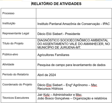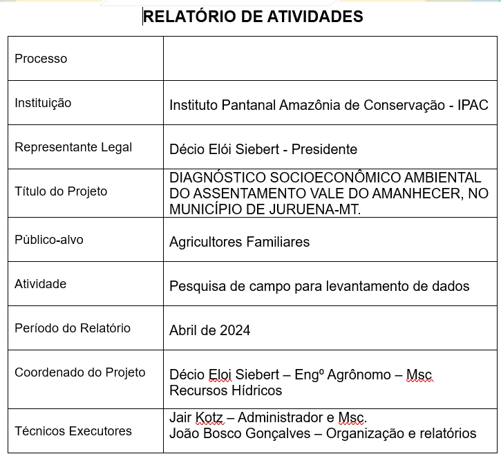 The research was conducted through field data collection, conducted in the form of interviews with farmers in the Vale do Amanhecer Settlement, in the municipality of Juruena-MT, in addition to some photographic records.