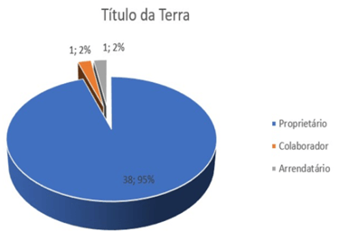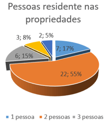 From the data collected, it was possible to verify that only one person lived in 7 properties, representing 17% of the total. This is because the couple usually has children in school, so the wife is forced to live in the city to take care of these children. Of the total, 22 properties are inhabited by a couple (55%), 6 properties are inhabited by 3 people (15%), usually a couple and a small child who has not yet entered school age. In 3 properties, 4 people live (8%), usually two couples, and in 2 properties (17%) there are 5 people living.