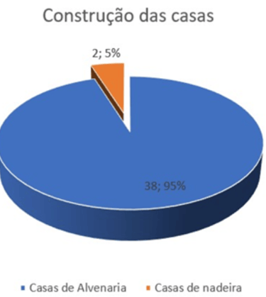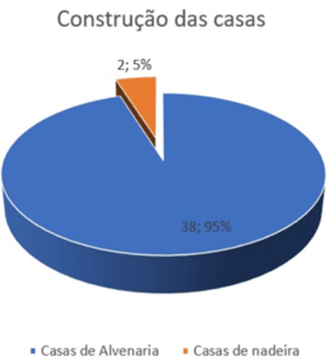 The main houses are made of masonry and some structures are still made of wood, but the vast majority are built of masonry, with an average of 40% without any type of finishing such as plastering and flooring, and some are very well built. Of the total, 2 are made of wood (5%) and 38 are made of masonry (95%).