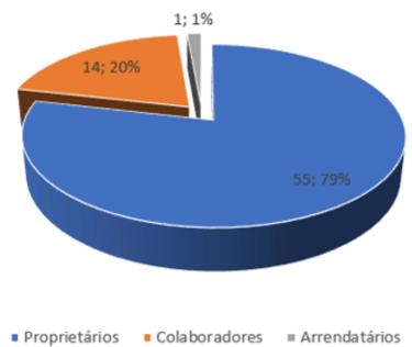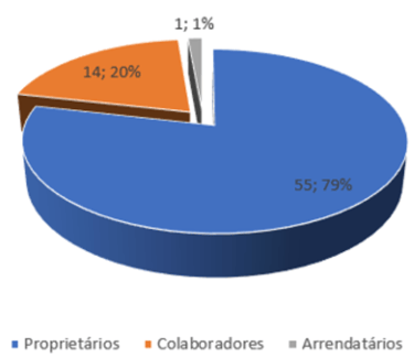 From this survey carried out on 70 properties, regarding the title of the properties visited, the following data were obtained: 55 (79%) are landowners and live on the site, 14 (20%) are collaborators and 1 (1%) of the properties is leased.