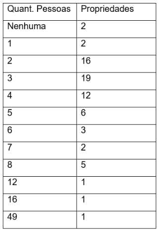 From this data it can be seen that in two properties, the owners live in the city, do not produce because they do not have the means and intend to sell. Significantly, in 12 properties we found 4 people, in 16 properties we found a couple and in 19 properties we found 3 people.